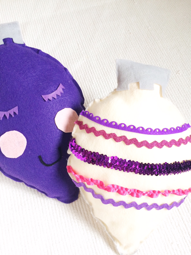 Step 2: Using a fine-tip marker, trace each shape onto the felt. Cut out each shape twice to create the front and back of each pillow. Cut the topper off of one ornament, and trace it twice for each pillow. Apply a thin line of hot glue to the edge of one shape, leaving a hole large enough to fit your hand. Align the matching shape, and press the two together to create your pillow. Glue the gray ornament topper piece onto the front and back of each pillow. Repeat for each ornament.